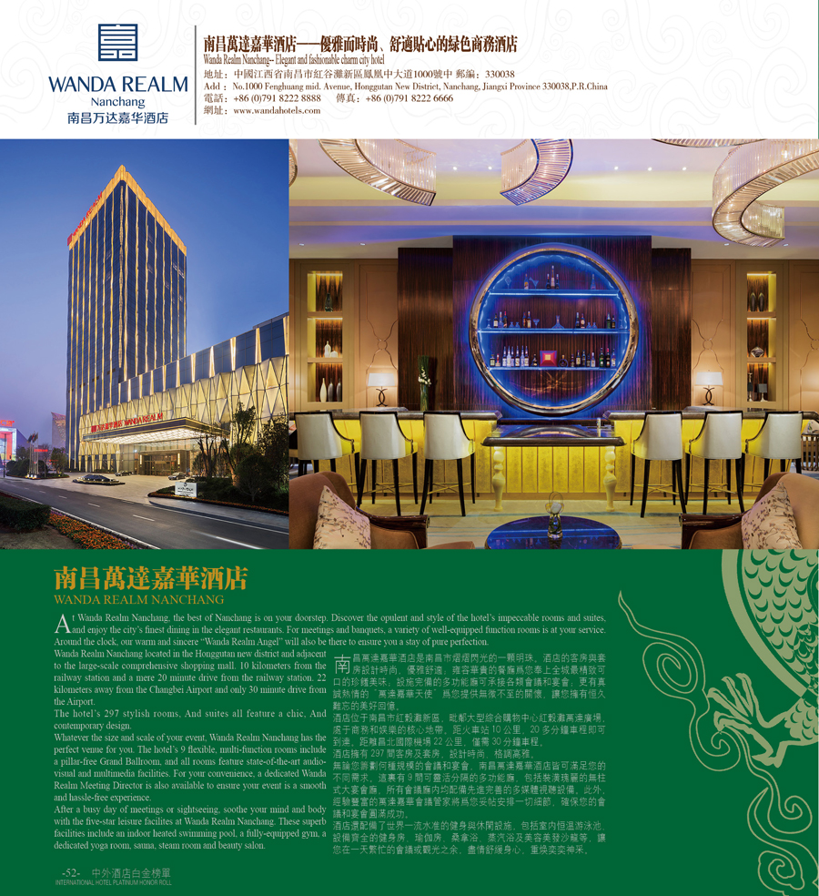 中外酒店十二届白金奖“十大绿色商务酒店”南昌万达嘉华酒店!